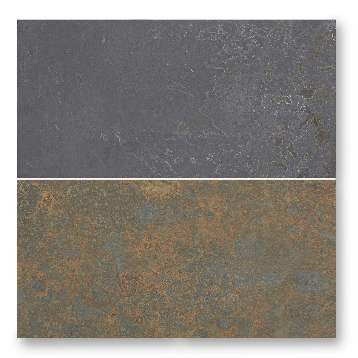 This striking textured natural slate from Brazil ranges in colour from gold to black with veins of minerals appearing throughout. This significant colour variation from tile to tile is a real feature and makes for a bold and dramatic floor.