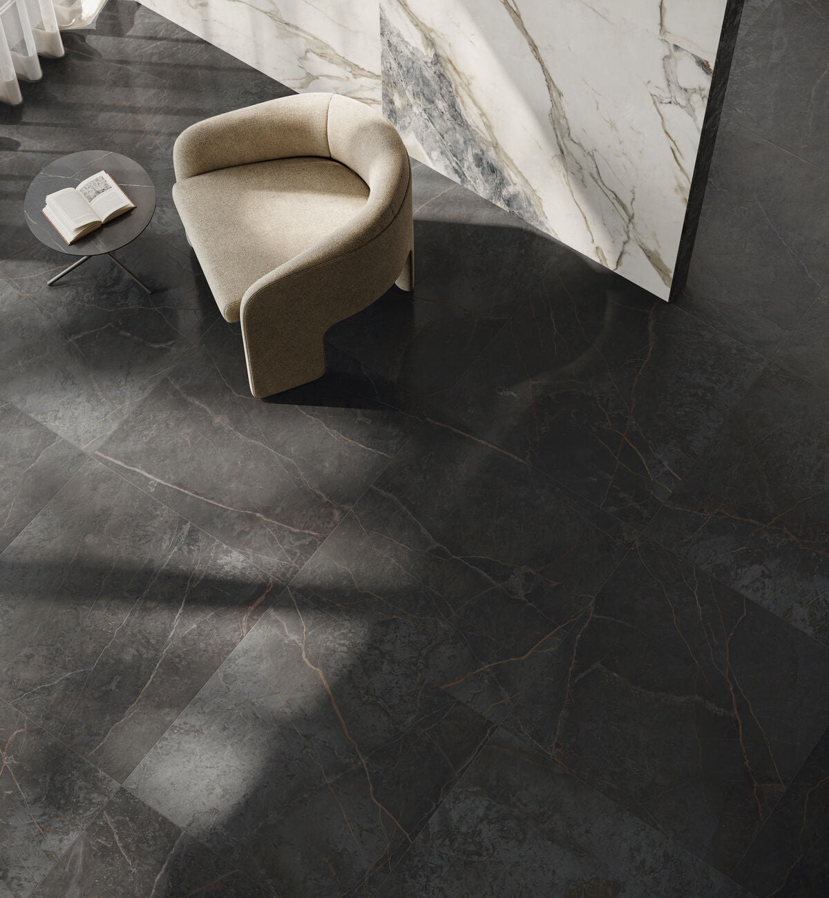 Introducing Milos, a stunning porcelain tile that exudes the elegance of black marble with its striking veining and depth. Elevate your space with the luxury look of natural marble, without compromising on durability and ease of maintenance. This porcelain tile captures the elegance of black marble with stunning realism, a sleek black finish with rich variation.
