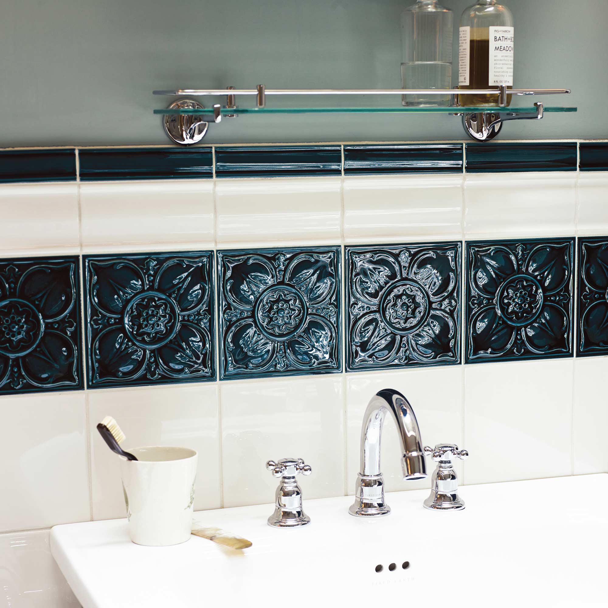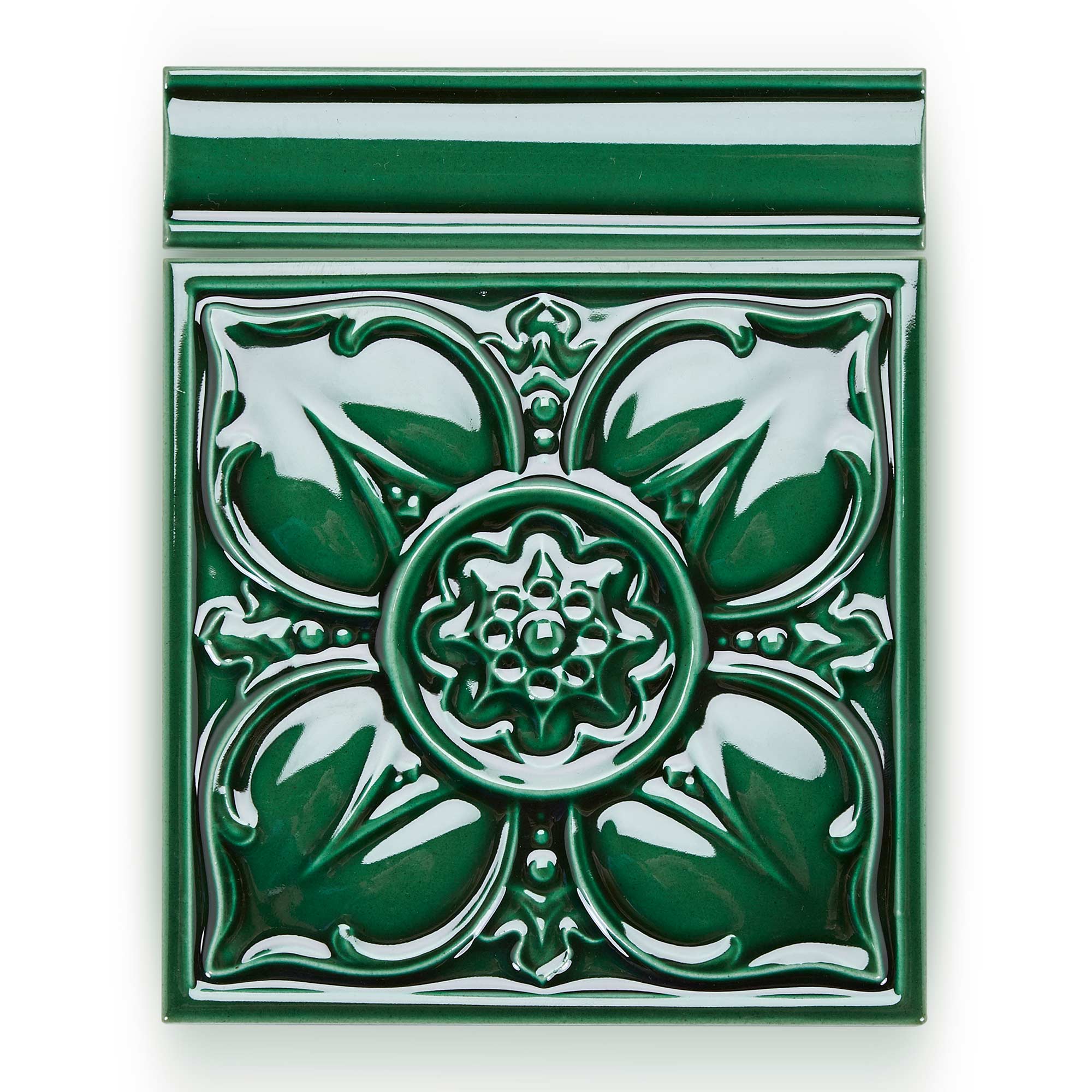 Our empress tiles are made to the original designs and quite possibly using the same moulds. They offer a classic arts and crafts take on botanical themes in a relief pattern, and are available in hues that would have been familiar during the reign of queen Victoria.