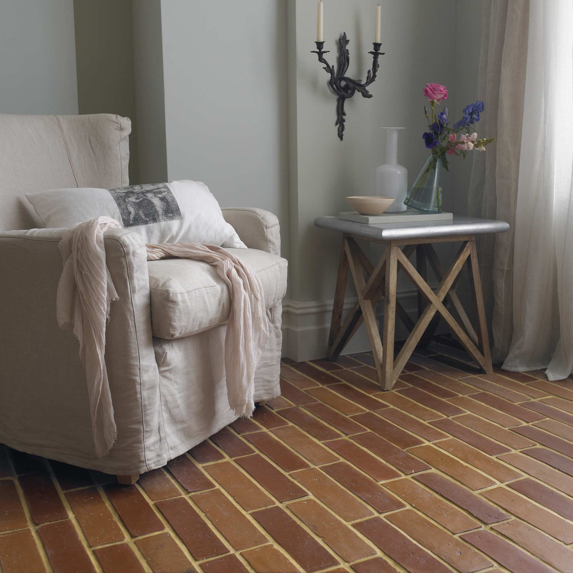 As with all reclaimed products, expect variations in size, depth, and tone, as well as traces of ridges or mortar on the reverse side (which should be laid facing down). The tiles are sprayed with water during cutting and processing hence may be wet upon receipt on site, so should be dried before installation. Once sealed, the surface colour deepens and matures with time, producing a floor that only improves with age and use.