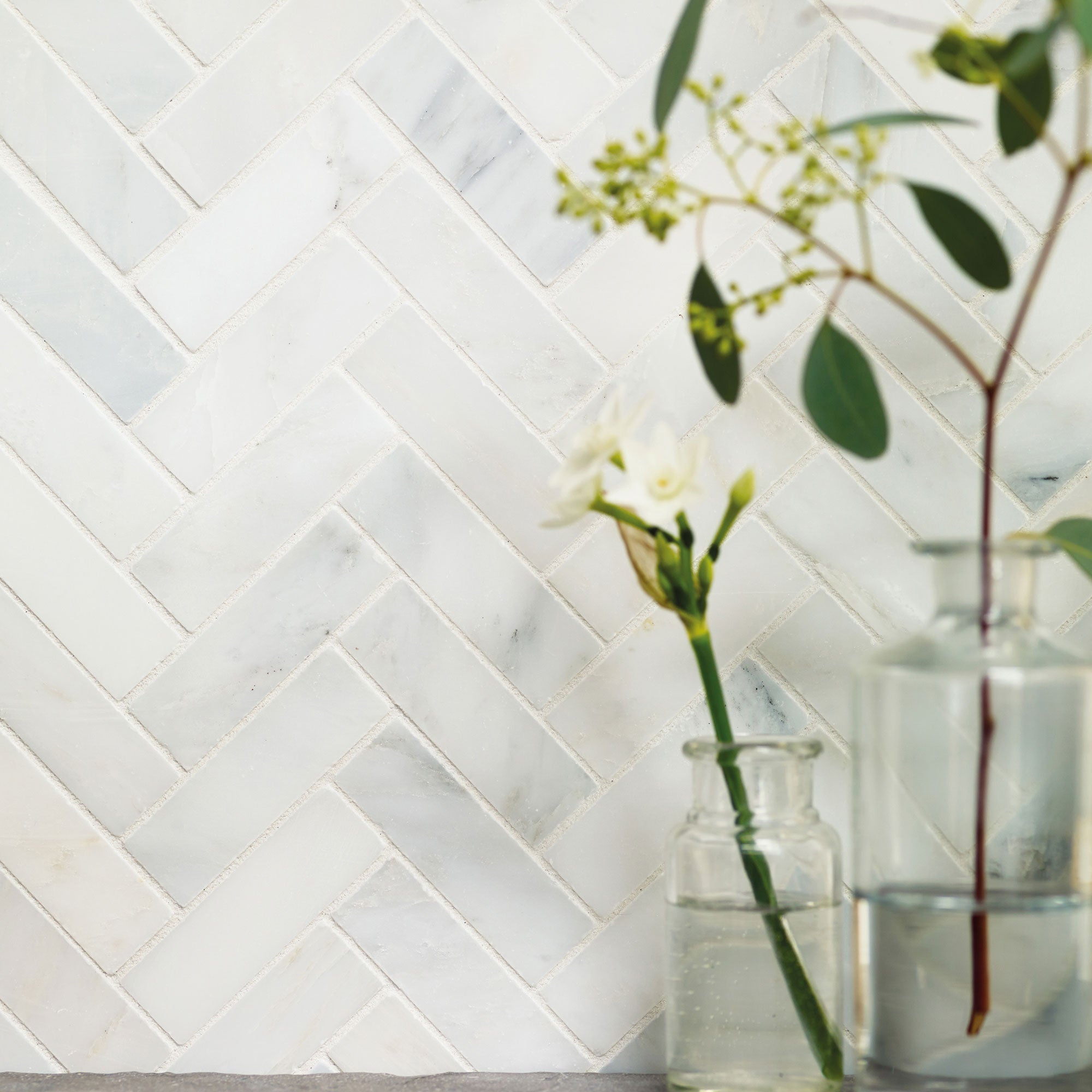 The East Hampton Herringbone Marble tile is a beautiful and elegant mosaic tile featuring cool grey veining. Crafted from a hard-wearing, dense, and durable stone, it is perfect to use as bathroom floor tiles, wall tiles and shower tiles. With its diamond-sawn, honed finish and straight edges, it offers a clean, classic look that can be paired with other East Hampton marble tiles to create a dramatic and varied design.